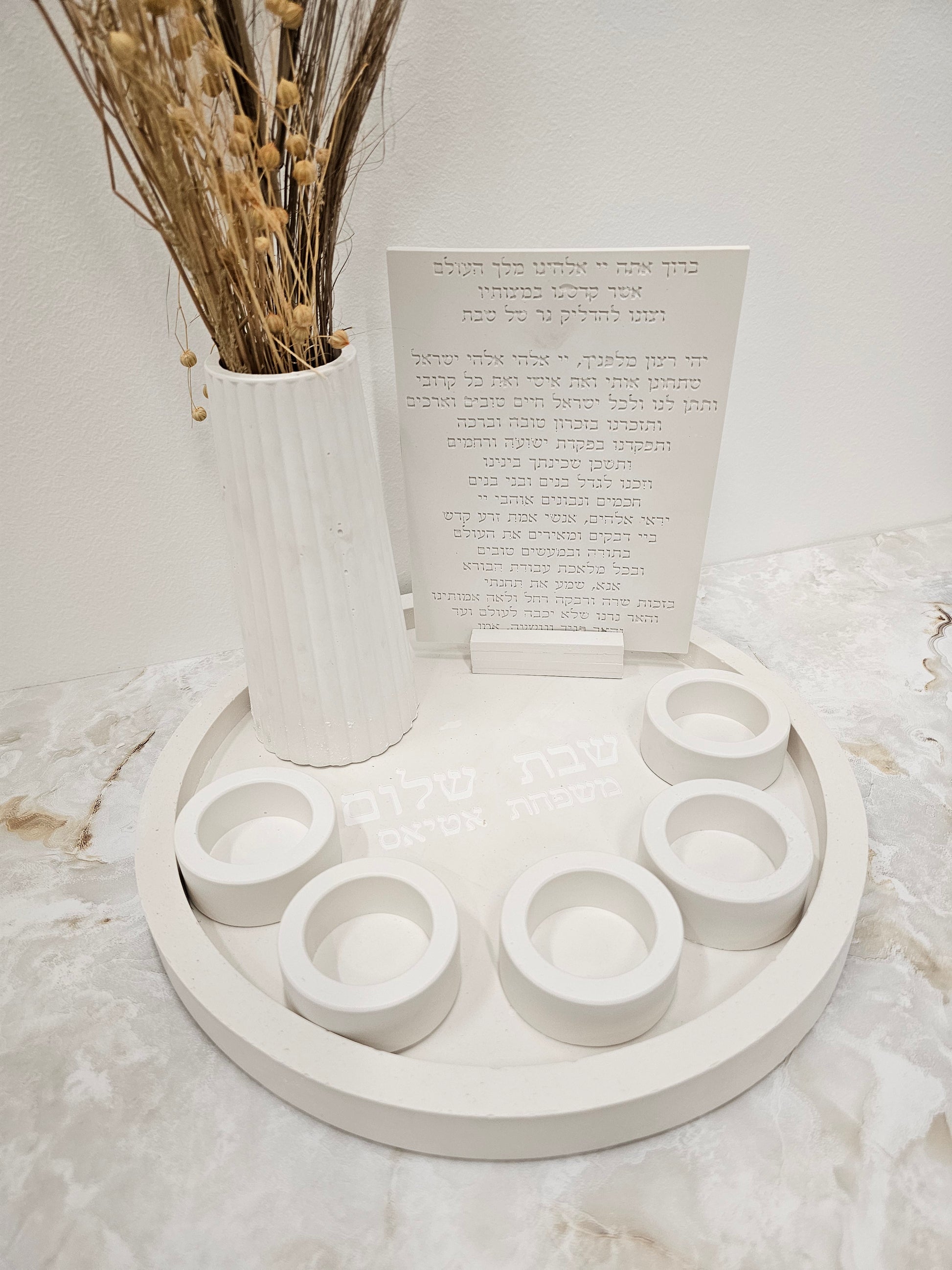 This set includes a matching blessing plaque engraved with the traditional Hadlakat Nerot (Shabbat candle lighting prayer), making it both a functional piece and a meaningful reminder of tradition. A tall, ribbed vase completes the design, perfect for adding dried florals or fresh flowers for an elegant touch.