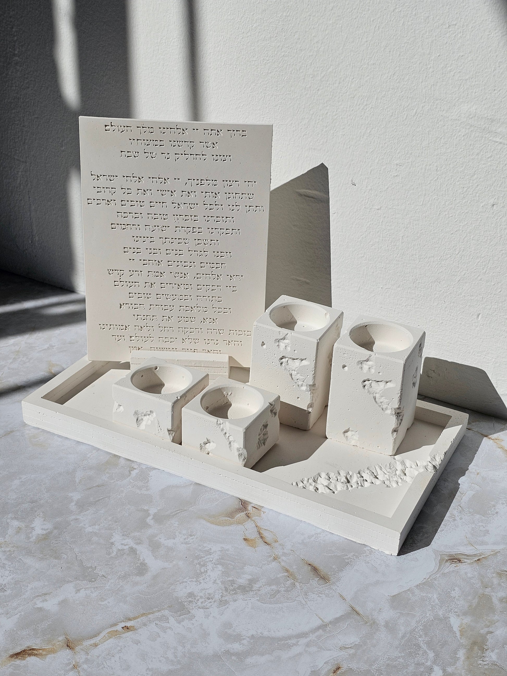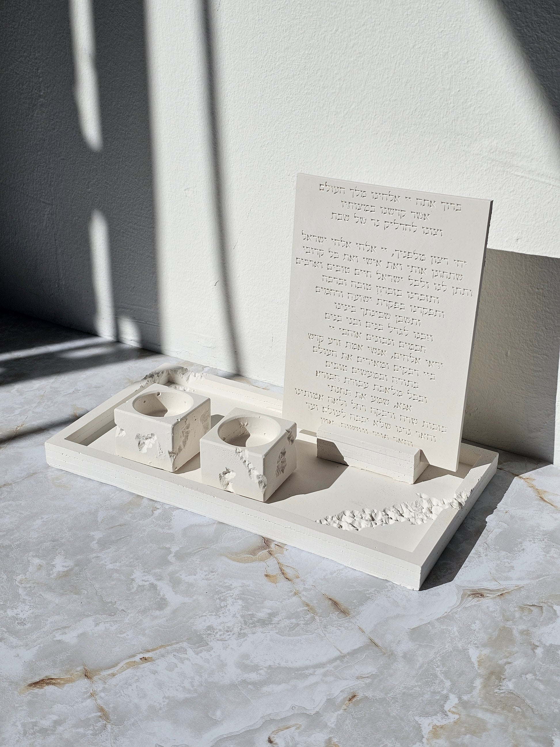 Designed with intention, each piece has a sculpted raw finish, giving the look of natural carved stone. Strong, minimal, and filled with holiness—this piece adds depth and elegance to any Jewish home.